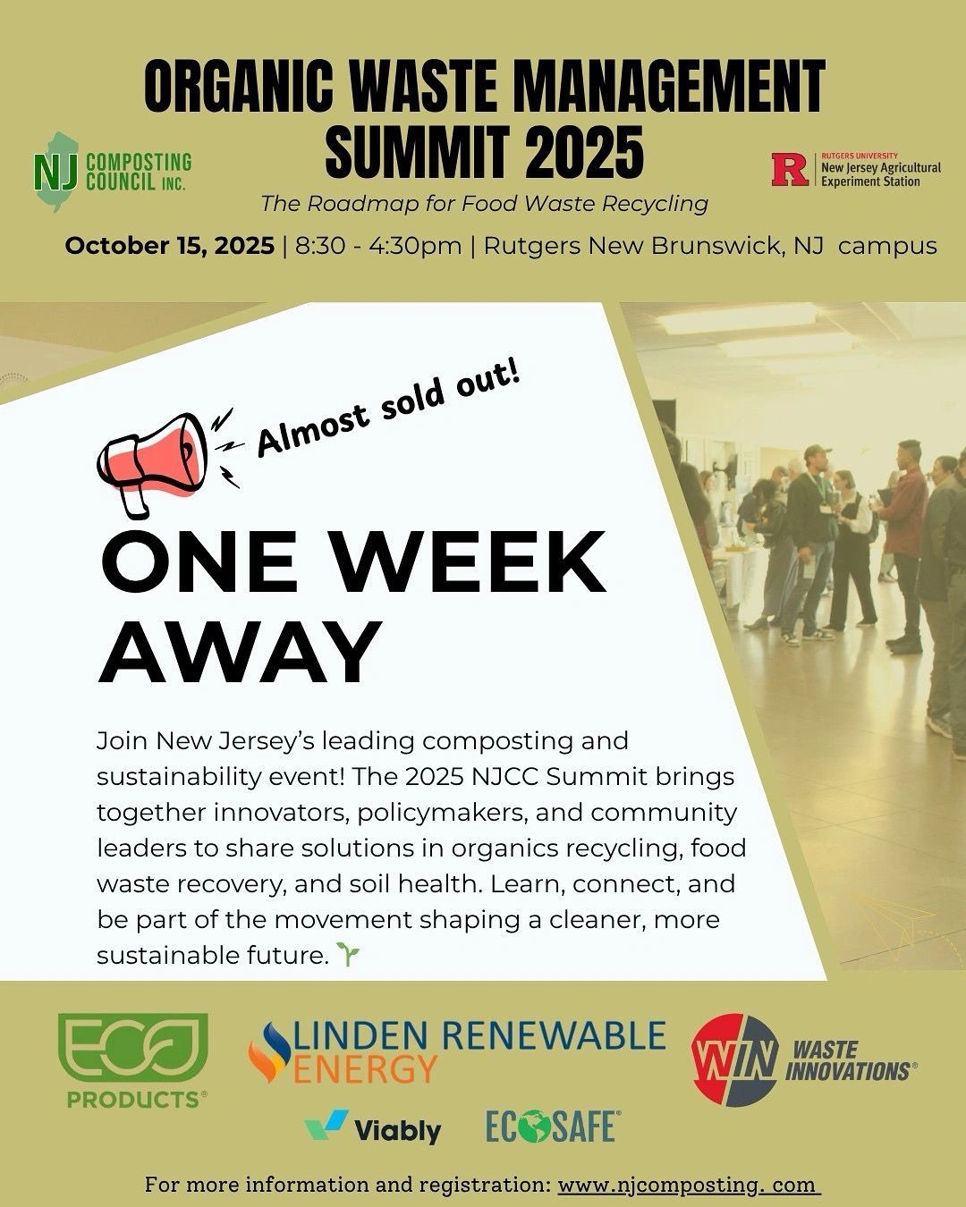 The Organic Waste Management Summit 2025 is almost here! Join composting leaders and sustainability advocates from across New Jersey for a day of learning, collaboration, and inspiration. Limited spots remain — don’t miss your chance to help shape the future of food waste recovery!